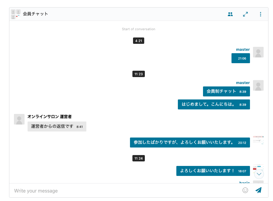 会員同士(及び運営者)がチャットを通じてリアルタイムに会話をすることが出来ます。